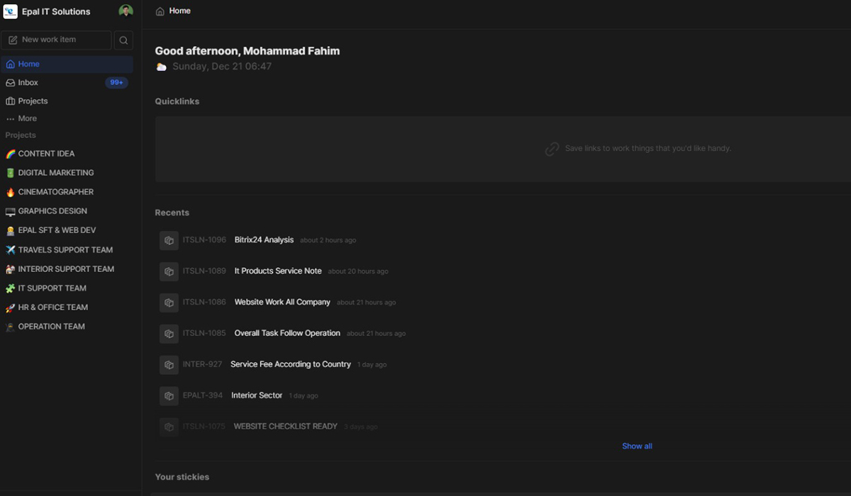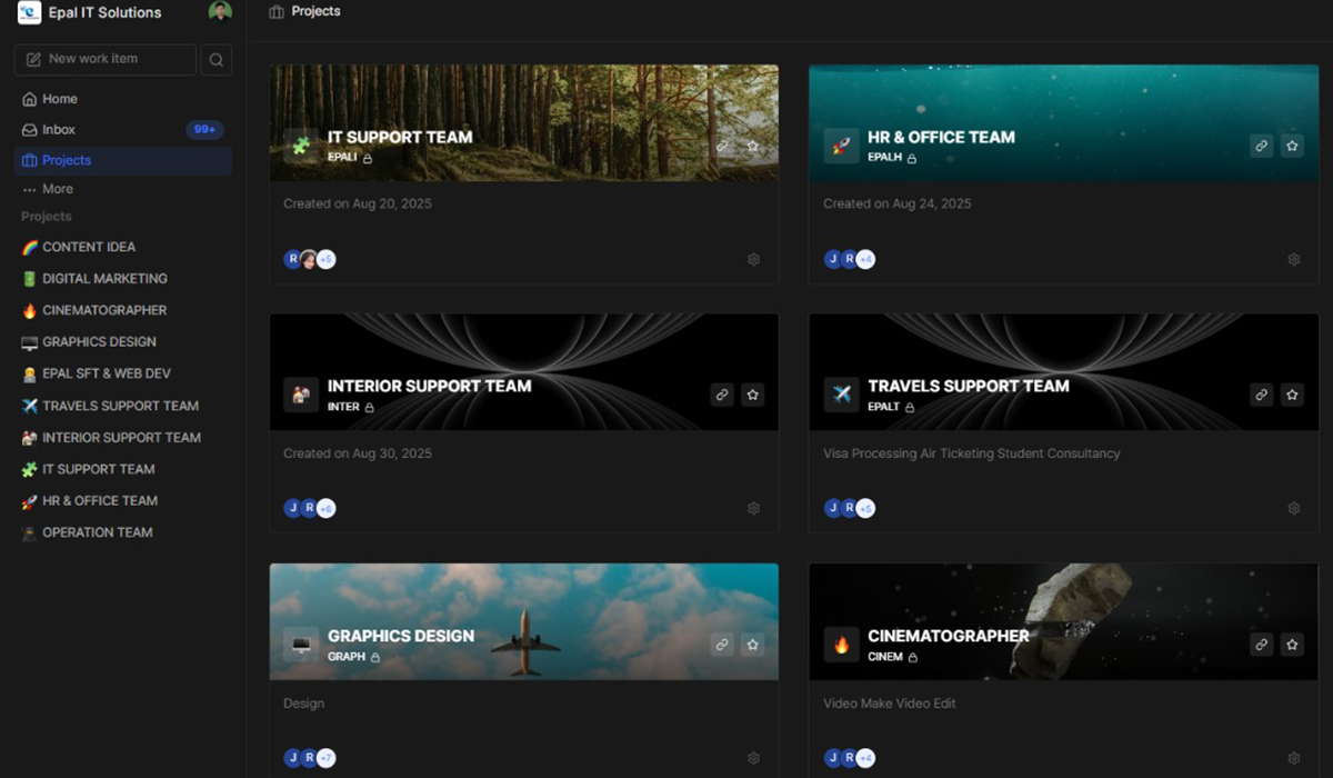 Separate projects for each team (IT Support, HR, Interior, Travels, Operation, etc.)